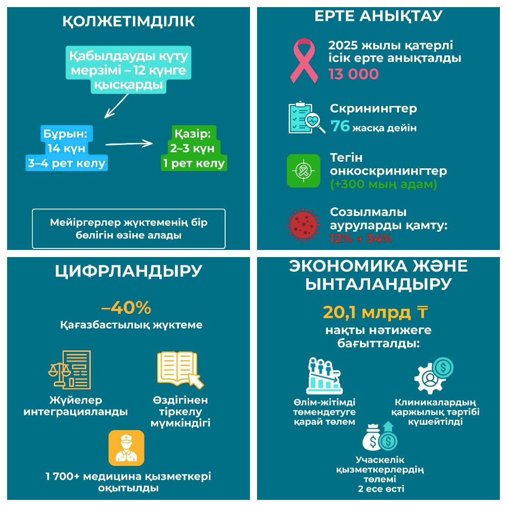 Онкоскринингтер тегін медициналық көмектің кепілдік берілген көлеміне ауыстырылды, бұл 300 мың сақтандырылмаған азаматтар үшін тексерулерге қолжетімділікті қамтамасыз етті.